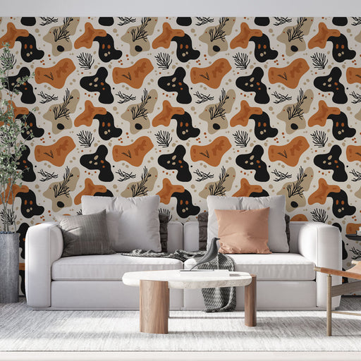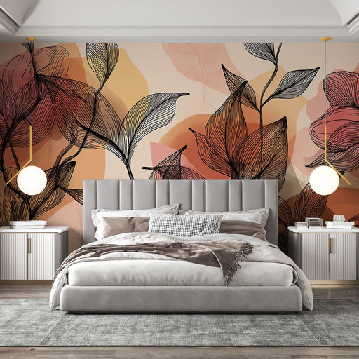 WonderMuralThis wallpaper features a beautiful abstract pattern composed of delicate leaves in black lines, juxtaposed with organic shapes in warm shades such...