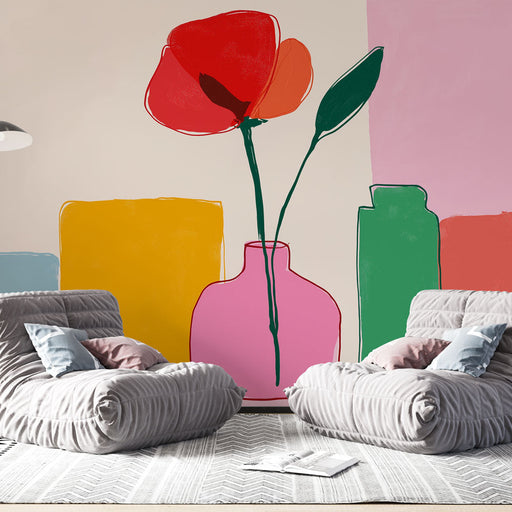 WonderMuralOur superb mural wallpaper features an abstract design combining vibrant geometric shapes and stylized flowers. The shades of red, orange, blue, an...