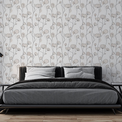 WonderMuralThis enchanting mural wallpaper features a subtle motif of buds hand-drawn in soft shades of beige and black on a white background. The fine lines ...