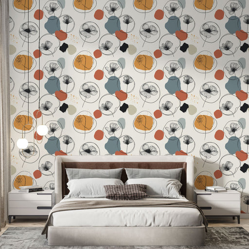 WonderMuralThis wallpaper features an elegant pattern of stylized flowers with delicate lines, gracefully rising against a bright background. Circles in warm ...
