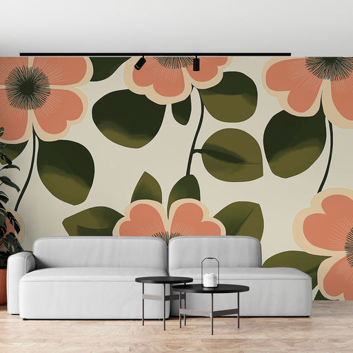 WonderMuralOur wallpaper features a charming pattern of stylized flowers in earthy shades of red and orange, on a creamy background that adds warmth and depth...