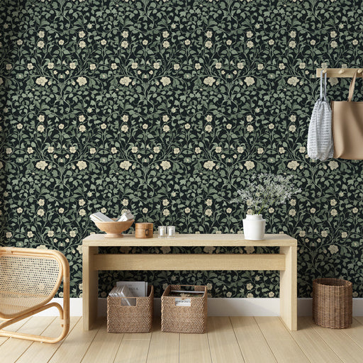 WonderMuralDiscover our vintage floral wallpaper, featuring small cream flowers and leaves on a dark background. This combination creates an atmosphere that i...