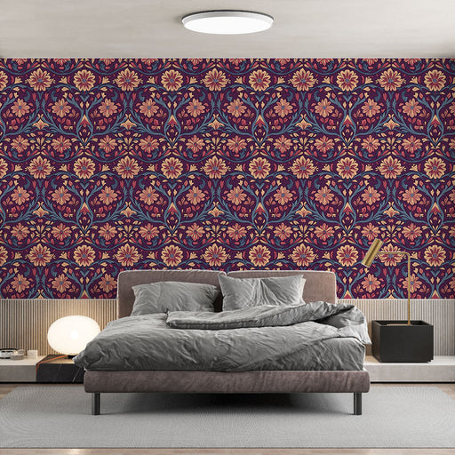 WonderMuralOur exclusive mural wallpaper features an elegant vintage floral pattern, where delicate pink and gold flowers harmoniously dance on a deep purple ...