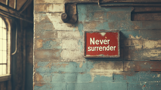 WonderMuralThis mural wallpaper features a powerful message: 'Never surrender', inscribed on a backdrop of bluish tones and rustic textures, ideal for infusin...