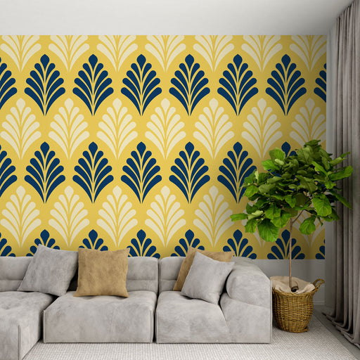 Studio SamaAdd a touch of retro chic to your interior with our yellow and navy blue geometric mural wallpaper. This design features elegant leaf-shaped patter...