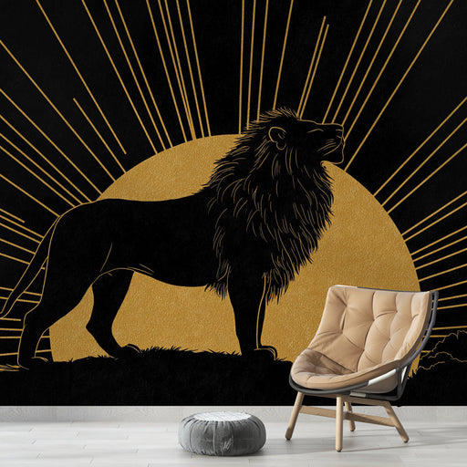 WonderMuralNáš skvělý fototapet s majestátním lvem v zlatém siluetě, který pyšně stojí před velkým zlatým sluncem. Černé pozadí zdůrazňuje eleganci a sílu vzo...