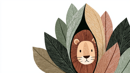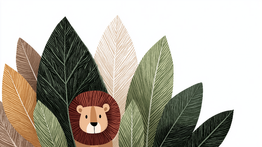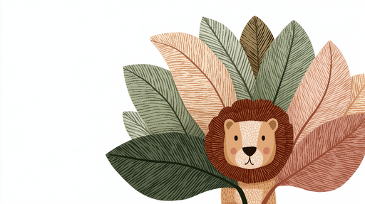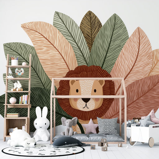 WonderMuralTento krásný tapetový papír zobrazuje kresleného lva s jemnou tváří, zanořeného mezi listy v zemitých, přírodních tónech. Vzory listů jsou pečlivě ...