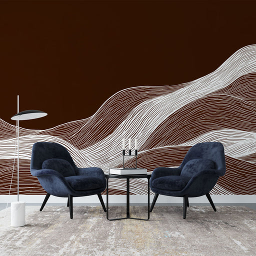 WonderMuralTento tapet má elegantní vzor lineárních vln v bílé barvě kontrastující s bohatým hnědým pozadím, vytvářející moderní a uklidňující atmosféru. Teku...