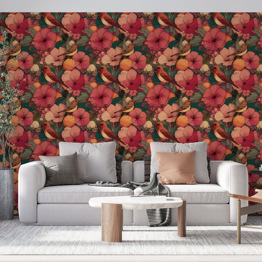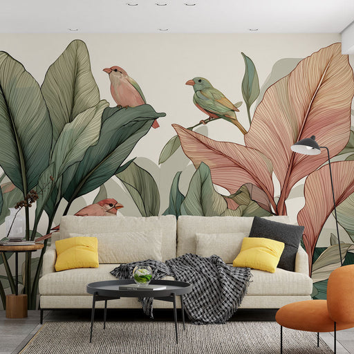 WonderMuralTento umělecký fototapet s živým vzorem s barevnými ptáky posedlými mezi bujnými květinami a stylizovanými listy. Teplé odstíny růžové a žluté pták...