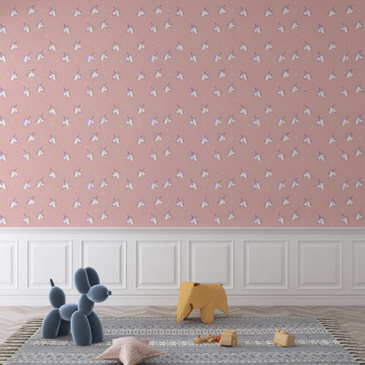WonderMuralTento okouzlující fototapetový obraz má hravý vzor barevných jednorožců na jemně růžovém pozadí, ideální pro vytvoření kouzelné atmosféry v jakémko...