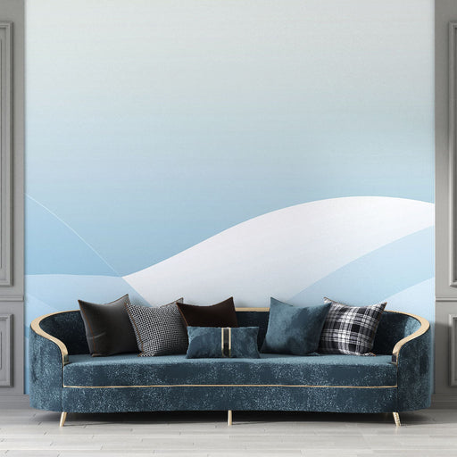 WonderMuralTato elegantní tapeta s motivem vln v gradientu od světle modré po tmavou modrou. Jemné tvary a jemné přechody vytvářejí uklidňující atmosféru, ide...