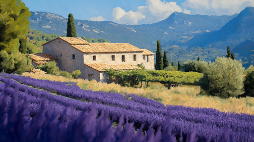 WonderMuralEvokující klid levandulových polí v květu, naše Tapeta zobrazuje okouzlující Provensálskou krajinu s starým kamenným statkem. Řady fialové levandul...