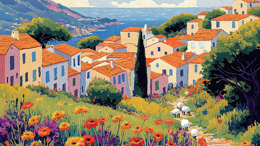 WonderMuralObjevte naši krásnou tapetu zobrazující Středomořskou krajinu, kde se malebná vesnice s domy v pastelových barvách a červenými střechami klidně táh...