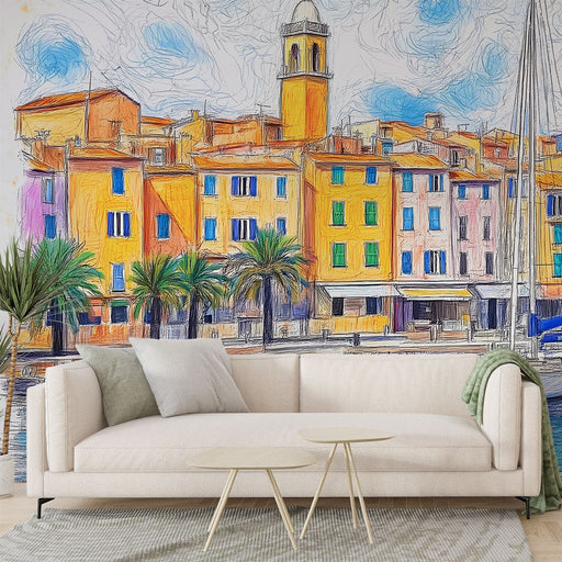 WonderMuralNáš fototapeta zobrazuje okouzlující Středomořský přístav osvícený sluncem, s domy v teplých odstínech žluté a oranžové. Malba evokuje klidnou atmo...