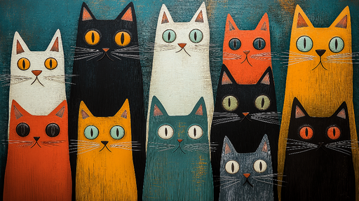 WonderMuralTato hravá tapetová malba zobrazuje zarovnání koček se stylizovanými designy, každá v živých barvách jako černá, bílá, oranžová a žlutá. Velké kula...