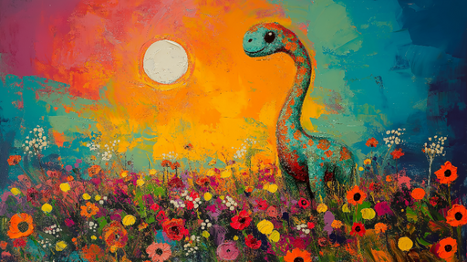 Zobrazit celý detailTapeta barevný dinosaurus | Hravá scéna v živém květinovém poli