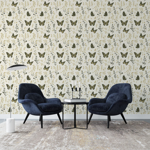 WonderMuralNáš vybraný Tapete ukazuje okouzlující florální design s elegantně uspořádanými zlatými motýly mezi jemnými stonky, vše na hlubokém a uklidňujícím ...