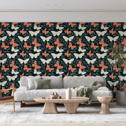 Zobrazit celý detailTapeta s motýly | Motiv s motýly a terakotovými akcenty na tmavém pozadí