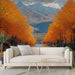 Tento působivý fototapeta má živou scénu podzimní, kde je cesta lemována stromy s planoucími zlatými listy. Teplé odstíny oranžové kontrastují s oblačnou oblohou a horami v pozadí, vytvářejíce klidnou a přívětivou atmosféru.