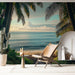 Tento tapetový obraz vyvolává klidnou tropickou krajinu, kde majestátní palmy rámuje uklidňující pohled na oceán. Jemné ranní světlo osvětluje klidné vody a jemné mraky, vytvářející relaxační a přívětivou atmosféru.