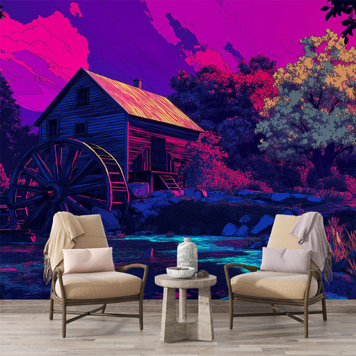 WonderMuralObjevte naši tapetu s tradičním mlýnem v živých barvách, s majestátním vodním kolem. Okouzlující krajina, zalitá odstíny fialové a růžové, vytváří ...