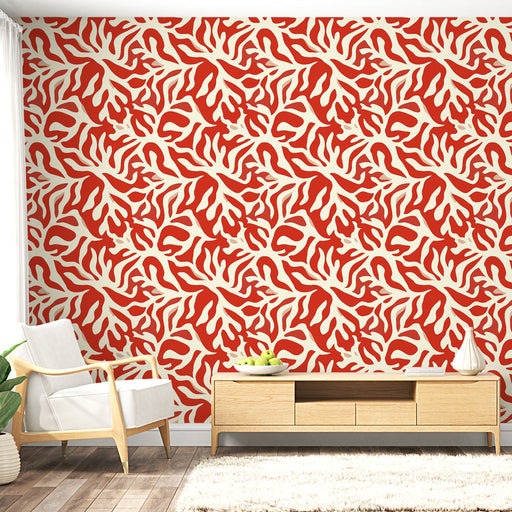 WonderMuralObjavte naše tapety s organickými vzormi, kde elegantné krivky kvitnú na krémovom pozadí. Ohnivá červená farba oživuje dizajn a vytvára teplú a dyn...