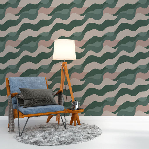 WonderMuralNáš krásný tapetový papír představuje poutavý motiv vlnění vln v harmonické paletě pastelových odstínů, včetně jemných odstínů zelené, růžové a kré...