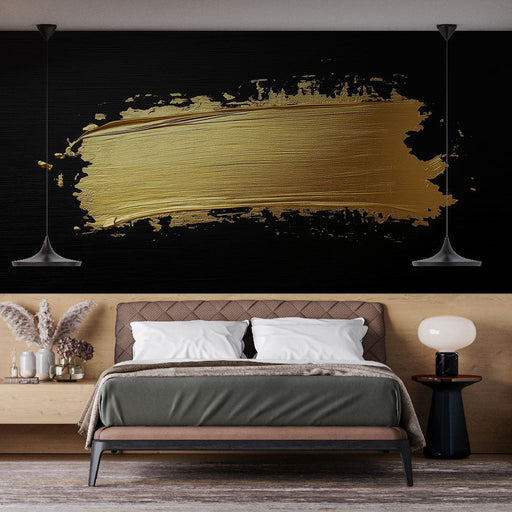 WonderMuralTento tapetový obraz obsahuje elegantní abstraktní vzor s širokým zlatým pruhem, který krásně kontrastuje s hlubokým černým pozadím. Refined textur...