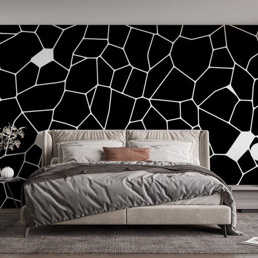 WonderMuralČernobílý mozaikový tapetový obraz Tento tapetový obraz má abstraktní mozaikový vzor s nepravidelnými bílými tvary oddělenými tenkými černými čaram...