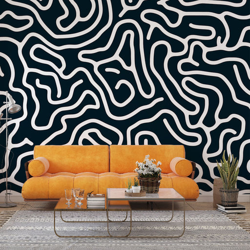 WonderMuralTato tapeta s organickým vzorem s nepravidelnými bílými liniemi vinoucími se na hlubokém černém pozadí. Působivý kontrast mezi tmavým pozadím a kři...