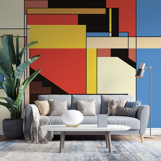 WonderMuralTato úchvatná tapeta s fotografií má abstraktní design složený z dynamických geometrických tvarů v živých odstínech červené, žluté a modré, zdůrazn...