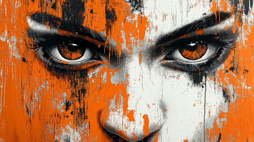 WonderMuralTento působivý tapetový mural zdůrazňuje expresivní tvář obklopenou skvrnami oranžové , černé a bílé, vytvářející nápadný vizuální kontrast. De...