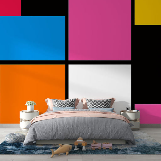 WonderMuralTento tapetový obraz má odvážný geometrický design s pestrobarevnými obdélníkovými tvary na černém pozadí. Živé odstíny modré, růžové, oranžové a ž...