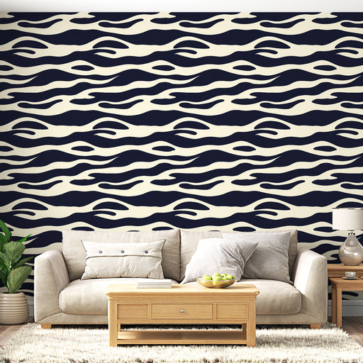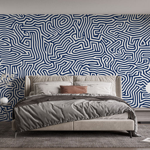 WonderMuralTato tapeta s motivem abstraktního designu se skládá z vlnitých linií, které tancují na světle bílém pozadí. Hluboké modré vzory dodávají dotek sof...