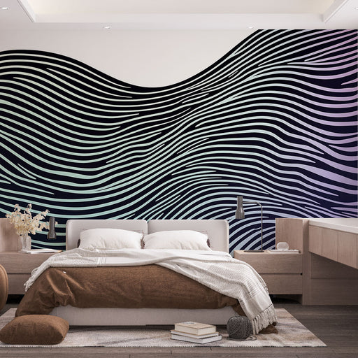 WonderMuralTato inovativní fototapeta má design vlnitých linií, které vytvářejí iluzi pohybu a hloubky. Odstíny černé se míchají s pastelovými přechody, nabíz...