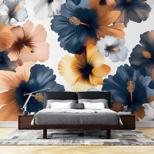 WonderMuralTento živý tapetový mural zobrazuje velké květy hibiscu v modrošedých a zlatých odstínech na bílém pozadí, vytvářející nápadný a elegantní kontrast...