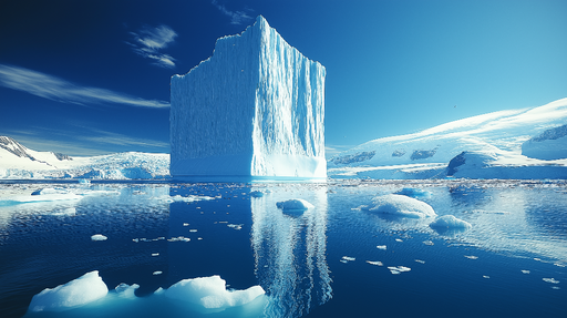 WonderMuralTato úžasná tapeta ukazuje majestátní ledovec vystupující z klidné vody a nabízí dechberoucí pohled na odkryté a ponořené části této přírodní divoč...