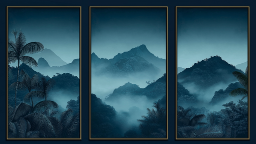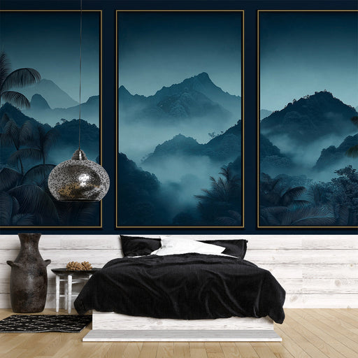 WonderMuralTato imitace tapety nabízí nádherný panoramatický pohled na mlhou zahalené hory, vytvořený v uklidňujících odstínech modré. Palmové stromy lemující...