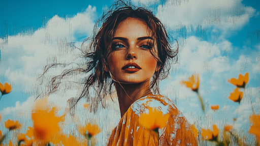 Art'loloTato ilustrace ženy s květinami zachycuje podstatu slunečného dne s ženou, která pozuje na poli žlutých květin. Světlé barvy a umělecký styl přináš...