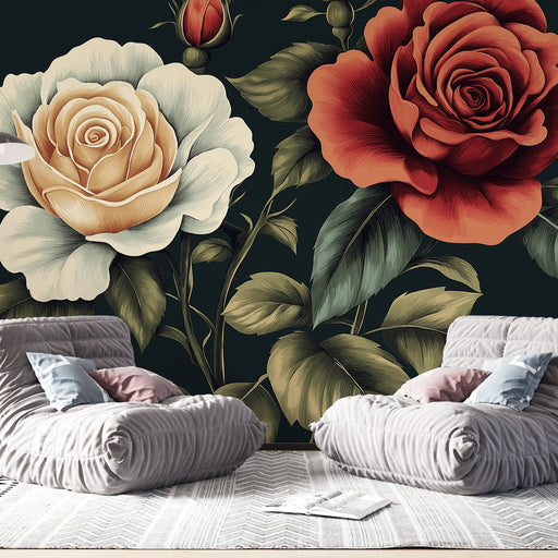 WonderMuralTento tapetový obrazový papír představuje nádherný vzor vintage růží, který ukazuje květiny nadčasové krásy na tmavém pozadí. Tóny hluboké červené ...