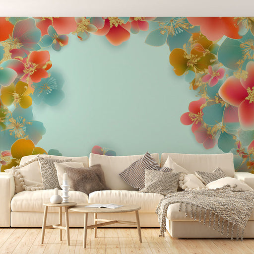 Zobrazit celý detailTapeta s květinovým motivem | Živé květiny na tyrkysové pozadí
