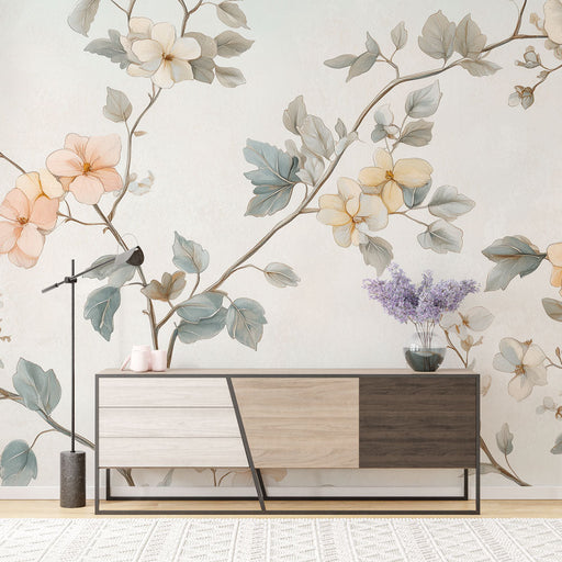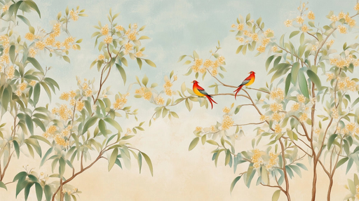 Art'loloTato tapeta ptáci a květiny nabízí uklidňující a okouzlující scénu s jemnými kvetoucími větvemi a barevnými ptáky. Ideální pro přidání doteku příro...