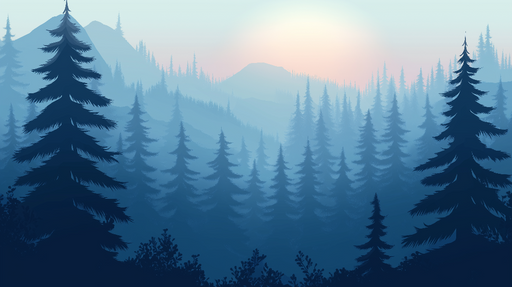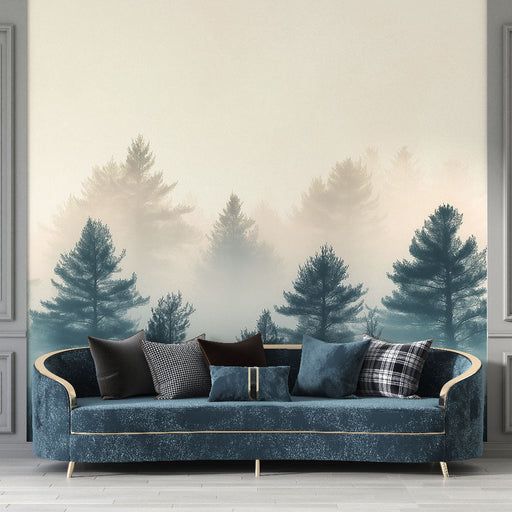 WonderMuralTato okouzlující tapeta zobrazuje mlžný les, kde majestátní borovice stojí v harmonii s uklidňujícími odstíny modré a jemnými tóny. Lehká mlha obkl...