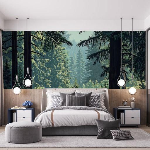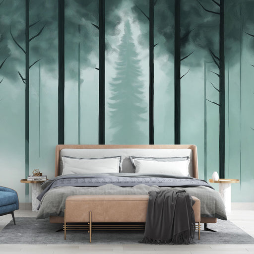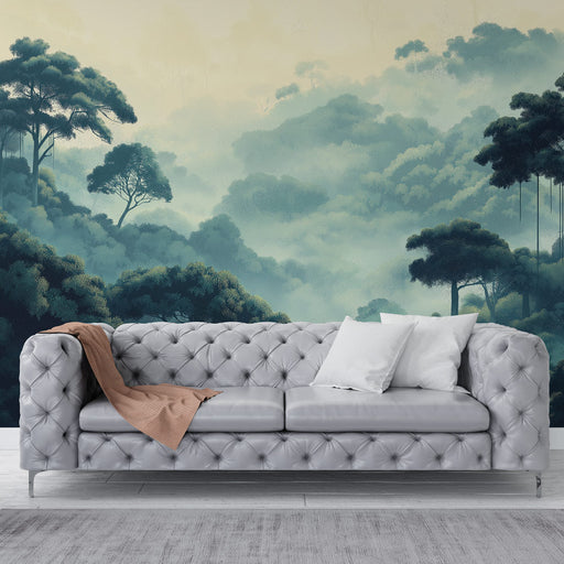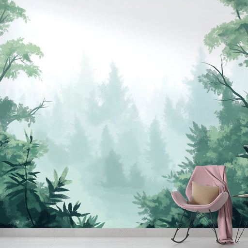 WonderMuralTato tapeta zachycuje esenci mlhavého lesa, s majestátními horami v pozadí a štíhlými stromy stoupajícími v mlze. Tóny zelené a modré smíchané s do...