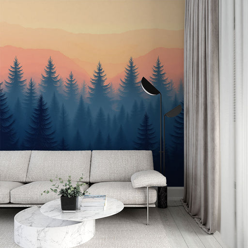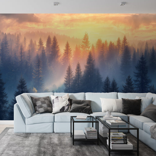 WonderMuralTato podmanivá tapeta zobrazuje mlhavý les ponořený do odstínů od fialové po modrou s teplým dotekem oranžové. Siluety stromů jsou jemně vykresleny...