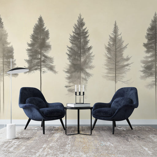 WonderMuralTento fototapet evokuje tajemný les, kde se majestátní borovice jemně vynořují z mlhy, vytvářejíce atmosféru, která je jak uklidňující, tak básnick...