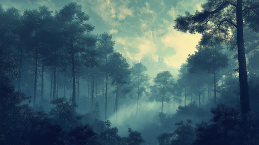 WonderMuralTato tapeta obsahuje mlhavou lesní krajinu, kde se v mystické atmosféře majestátně tyčí siluety borovic. Uklidňující odstíny modré a zelené se harm...
