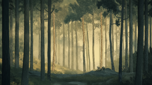 Zobrazit celý detailTapeta mlhavý les | Majestátní stromy splývající do klidné atmosféry