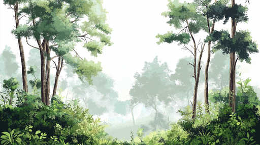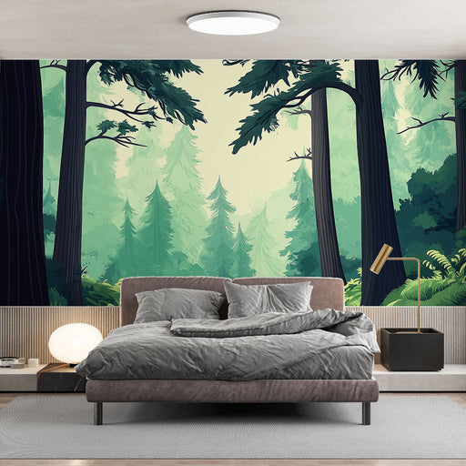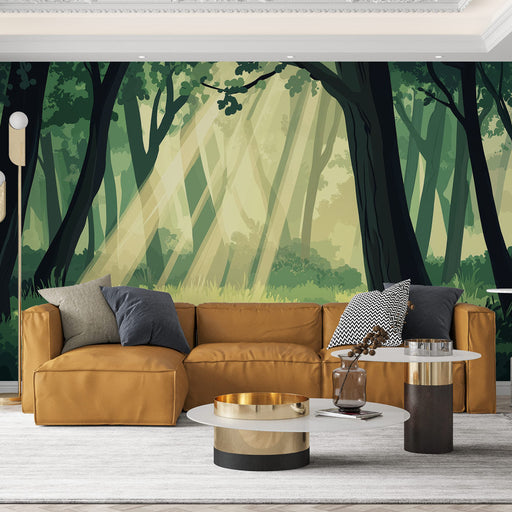 WonderMuralTato Tapeta nabízí uklidňující pohled na bujný les, kde vysoké vznešené stromy stojí uprostřed bohaté vegetace. Odstíny zelené, proložené doteky žl...