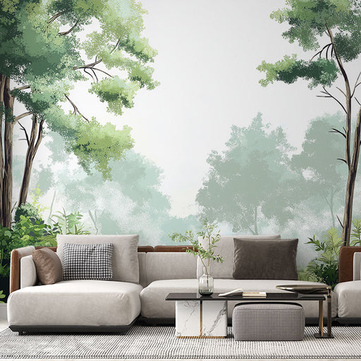 WonderMuralObjevte naši tapetu s motivy mlhavého lesa, kde se měkké a rozptýlené světlo mísí s bujnými listy a siluetami majestátních stromů. Tento design vyv...